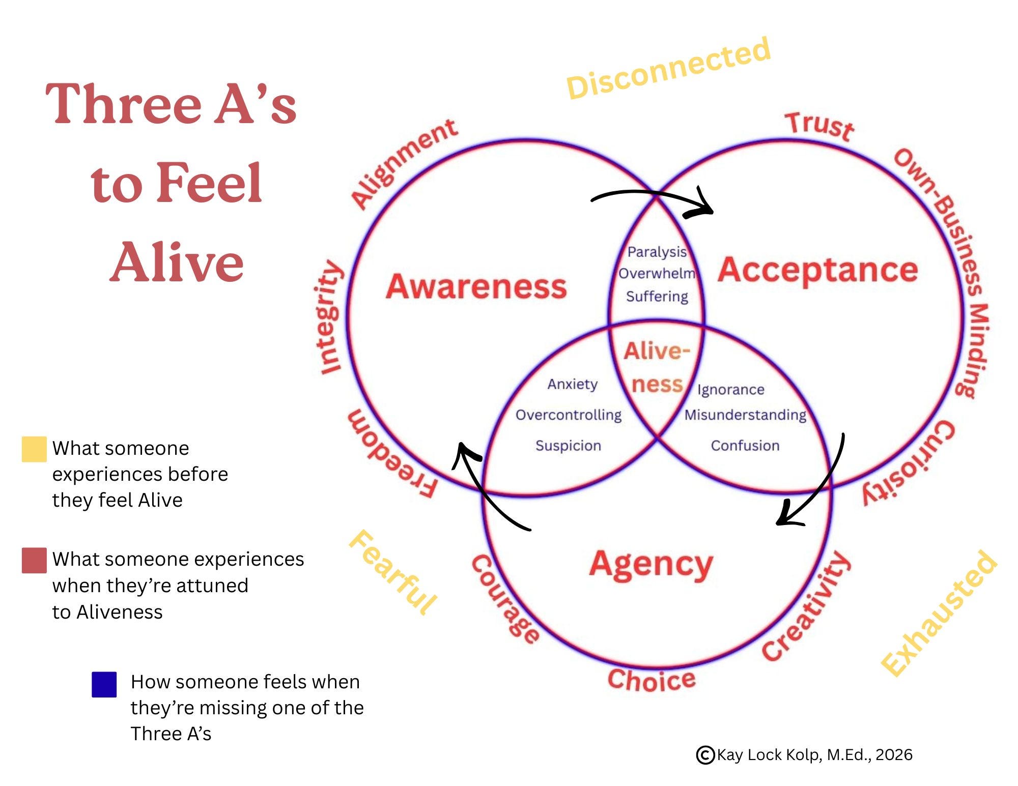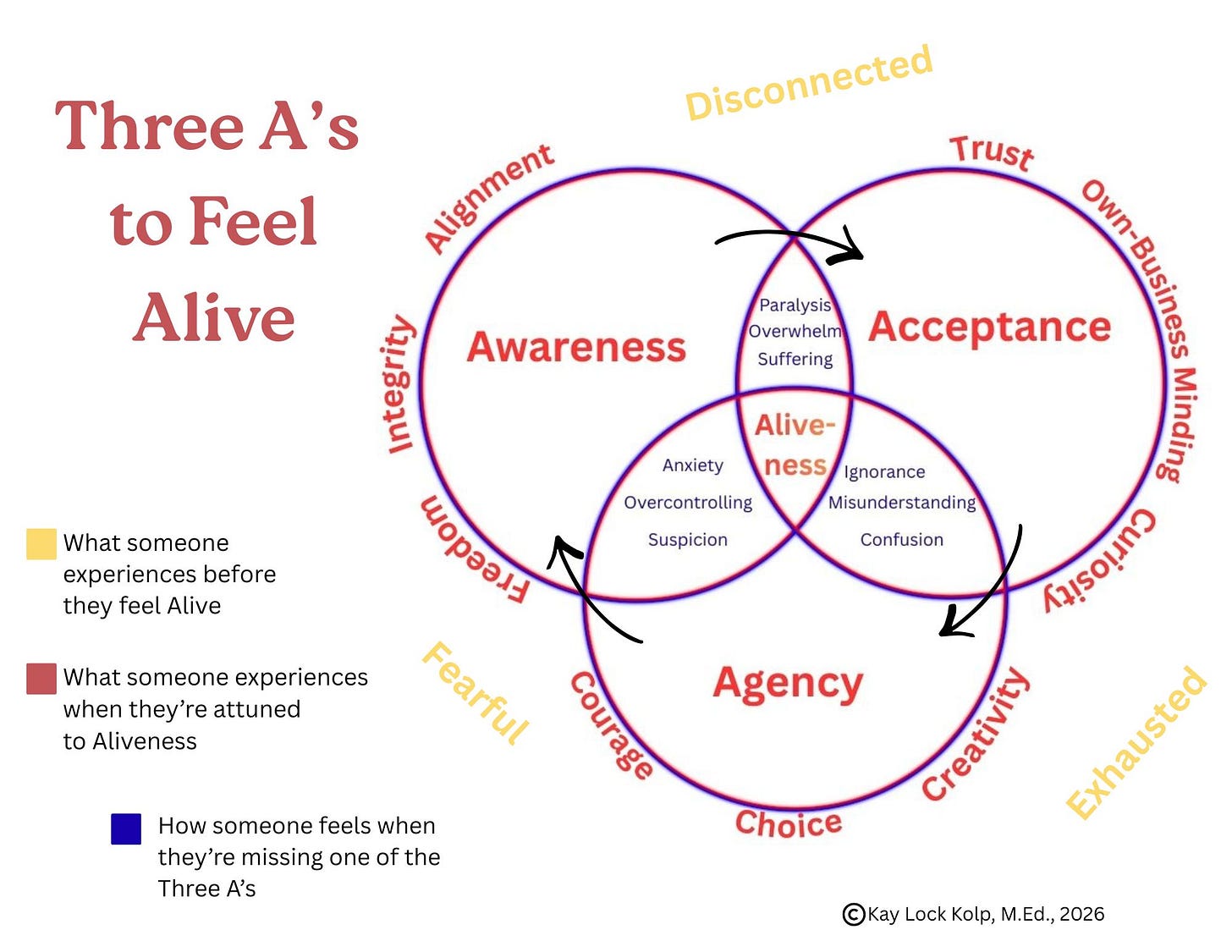 Kay discussed a Venn diagram about aliveness, explaining that movement through the diagram starts with awareness and then moves to acceptance. She noted that the word “disconnected” was near the awareness circle and “exhausted” was near the acceptance circle, suggesting a connection between being disconnected and lack of awareness, and between exhaustion and acceptance.
